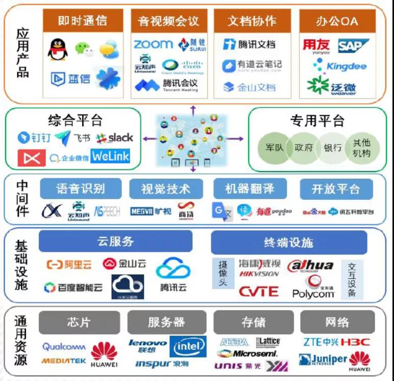國內(nèi)在線辦公起步較晚,但發(fā)展迅速且產(chǎn)業(yè)鏈條完整,如圖23所示。國外在線辦公軟件起步較早,用戶付費意愿較G。受到疫情影響,國內(nèi)在線辦公受到熱捧,有望培養(yǎng)用戶習慣,并形成可持續(xù)的商業(yè)模式。據(jù)國外機構(gòu)Apps Run The World數(shù)據(jù),2018年排名前10位的協(xié)作軟件供應商占協(xié)作整體市場的55.7%,其中微軟以占L20.8%的市場份額L跑市場,其次是思科、谷歌、LogMein和Slack。我國協(xié)同辦公市場規(guī)模也呈逐年擴大趨勢,據(jù)不完全統(tǒng)計,國內(nèi)提供協(xié)同辦公產(chǎn)品的企業(yè)約有500余家,2019年產(chǎn)業(yè)規(guī)模達到459.5億元。即時通訊:國內(nèi)互聯(lián)網(wǎng)公司技術(shù)和市場成熟;微信、釘釘、飛書、藍信等處于L先地位。音視頻會議:Zoom和思科Webex占據(jù)龍頭地位;國內(nèi)飛書、釘釘?shù)燃闪藭h功能,也有專注視頻會議的隨銳、全視通等。文檔協(xié)同:微軟憑借office軟件在占據(jù)著先發(fā)優(yōu)勢;金山得益于WPS office 的深耕,市場占有率逐步提G。辦公OA:國內(nèi)辦公OA歷史較長,主要企業(yè)包括用友、SAP、金蝶、金和、致遠互聯(lián)、泛微等。適應國內(nèi)習慣和需求,本土企業(yè)優(yōu)勢明顯。