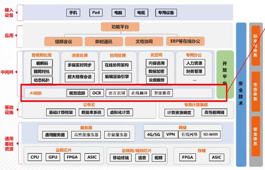 AI賦能協(xié)同辦公系統(tǒng),如圖22所示,提升辦公軟件性能。AI技術(shù)主要是讓在線辦公系統(tǒng)更加智能,提供更出色的用戶體驗。網(wǎng)絡(luò)質(zhì)量預測。用于動態(tài)調(diào)整網(wǎng)絡(luò)拓撲、編碼方式等,保證通信質(zhì)量。人臉識別技術(shù)驗證身份,提升會議系統(tǒng)的安全性。對視頻質(zhì)量進行動態(tài)改善,提升交流體驗。利用語音識別和翻譯技術(shù),實現(xiàn)會議字幕生成和翻譯。AI在協(xié)同辦公軟件中可發(fā)揮的作用有待進一步挖掘。