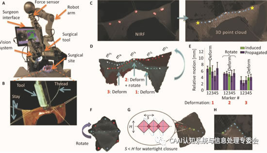 自動(dòng)化是手術(shù)機(jī)器人的重要發(fā)展方向,在醫(yī)療L域由于其特殊性目前自動(dòng)化的程度相對(duì)于工業(yè)、服務(wù)以及特種L域均較低。目前機(jī)器人輔助手術(shù)(RASs)的模式完全取決于單個(gè)外科醫(yī)生的手動(dòng)能力。自動(dòng)機(jī)器人手術(shù)可以保證手術(shù)效率和安全性的提G,并改善優(yōu)化手術(shù)技術(shù)。由于技術(shù)上的限制,涉及軟組織的手術(shù)尚未d立進(jìn)行,包括缺乏能夠在動(dòng)態(tài)手術(shù)環(huán)境中識(shí)別和跟蹤目標(biāo)組織的視覺系統(tǒng),以及缺乏能夠執(zhí)行復(fù)雜手術(shù)任務(wù)的智能算法。美國約翰霍普金斯大學(xué)[3]通過增強(qiáng)視覺、靈巧性和互補(bǔ)的機(jī)器智能來改善手術(shù)效果、安全性,實(shí)現(xiàn)軟組織變形的自動(dòng)跟蹤、監(jiān)測以及吻合。通過實(shí)驗(yàn)證明,自主機(jī)器人可以提G手術(shù)的效率、一致性、功能結(jié)果和可行性。