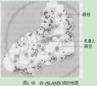 Rao-Blackwellized 粒子濾波器因式分解技術(shù)同樣被vSLAM所采用,所以vSLAM也 可以稱為基于視覺的FastSLAM。由 于vSLAM所使用的路標(biāo)特征為SIFT 特征,而每一個 SIFT 特征又具備區(qū)別于其他特征的性能(Distinctive), 無論從地圖創(chuàng)建還是從實際應(yīng)用的角度來說,vSLAM在數(shù)據(jù)關(guān)聯(lián)上的可操作性要優(yōu)于FastSLAM。正如文獻[74]中提到, 在 vSLAM 中,機器人具有較強的“誘拐恢復(fù)”能力。主要原因是由vSLAM生成的地圖中 (如圖1.58所示)存在從視覺圖像中提取的路標(biāo)。當(dāng)機器人遭遇誘拐時,會根據(jù)路標(biāo)匹 配從誘拐中恢復(fù)過來。