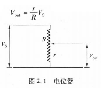 電位器是Z簡(jiǎn)單的位置傳感器,如圖2.1所示。電位器通 過電阻把位置信息轉(zhuǎn)化為隨位置變化的電壓,通過檢測(cè)輸出電 壓的變化確定以電阻中心為基準(zhǔn)位置的移動(dòng)距離。當(dāng)電阻器 上的滑動(dòng)觸頭隨位置變化在電阻器上滑動(dòng)時(shí),觸頭接觸點(diǎn)變化 前后的電阻阻值與總阻值之比就會(huì)發(fā)生變化。在功能上,電位 器充當(dāng)了分壓器的作用,因此輸出電壓Vout 與可變電阻r 成 比 例,即